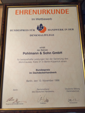 Die Firma Rolf Pohlmann - Dachdeckerbetrieb GmbH wurde am 01.05.1977 durch Rolf Pohlmann gegründet. Am 29. 03. 1994 wurde daraus die Pohlmann & Sohn GmbH und am 01. 03. 2002 erfolgte dann altersbedingt die Namensänderung in Frank Pohlmann - Dachdeckerbetrieb GmbH. Im Herbst 1998 erhielt die Firma den Bundesbaupreis für das Dachdeckerhandwerk in der Denkmalpflege in Berlin.
